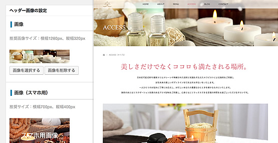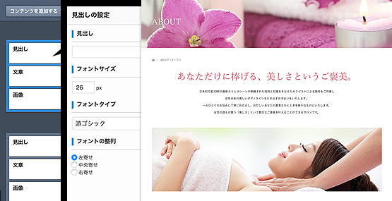 イメージに合った写真とお客様がイメージできる文章を用意すれば、テーマに用意された機能で、スムーズにデモサイトの様な美しいサイトが完成します。